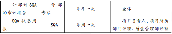 (5)SQA人員每周應(yīng)向項目負(fù)責(zé)人及質(zhì)量管理部經(jīng)理提交《SQA狀態(tài)周報》,匯報SQA人員的工作及項目遇到的問題和風(fēng)險。